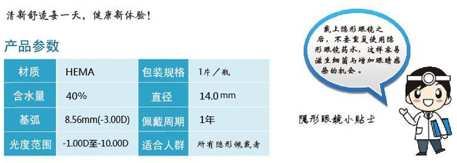产品说明: ★镜片采用先进离心浇铸工艺制造,表面质量光滑,配戴更舒适 ★边缘减薄且结构稳定,与角膜生理结构完全吻合,使您拥有无可比拟的舒适度 ★含有独特的保湿因子能有效的锁住水份,使你的眼睛长期保持润泽舒适